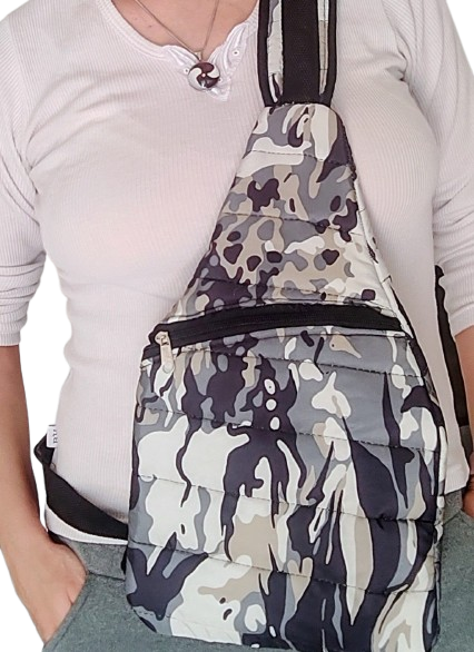 Bandolera realizada en tela puffer con un bolsillo interno. Acordar colores